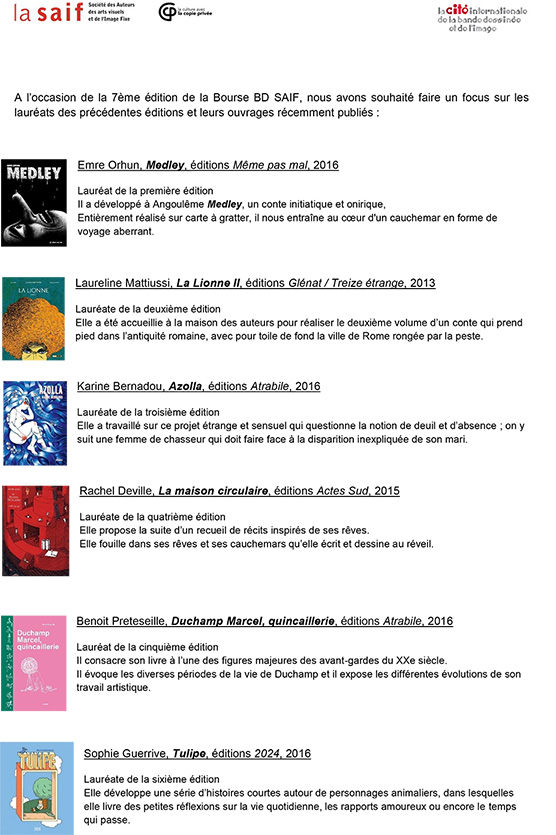 La SAIF et la Cité internationale de la bande dessinée et de l’image d’Angoulême ont le plaisir de s'associer pour la seizième année pour proposer ensemble la Bourse BD SAIF & CIBDI ! Cette bourse, combinée à une résidence, vise à soutenir des projets d'écriture et/ou de réalisation de bandes dessinées. Ce dispositif s'adresse aux auteur·ices dessinateur·rices et/ou scénaristes de bande dessinée. Il permet à l’auteur·ice en résidence de bénéficier d’un temps de création privilégié et d’une aide financière pour développer son projet de BD.
